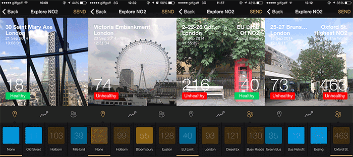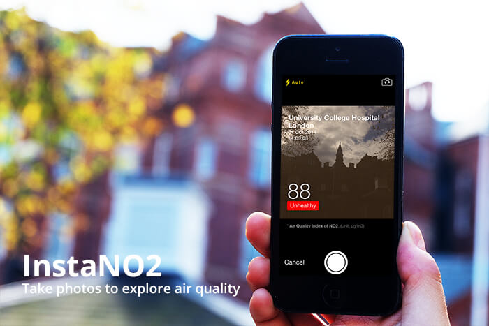 The app was designed as a camera app, which allowed people to explore the current NO2 level from places they were via an existing habitual behaviour, taking photos.
