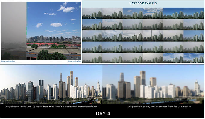 By applying photo filters, the app enabled users to compare the current air quality data with other locations and dates, and it also enabled users to talk and share air quality data instantly. The photo-based air quality data could be shared on social media, to a designed photo collection website and to the users’ My Places stream, for users to check the real-time air quality at places they had been to.