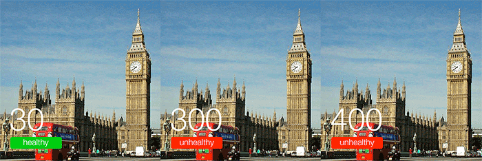 It's easy to tell the difference between the first and the second images, because one says healthy and the other says unhealthy. But it's difficult to tell the difference between the second and the third images. Only using numbers and red colours, the difference between 300 μg/ m3 and 400 μg/m3 could not be felt. But the photographs and photo filters visualized the difference between numbers and enabled participants see the severity of air pollution visually by adjusting the appearance of photos, thus it made the air quality data on top of photos understandable.