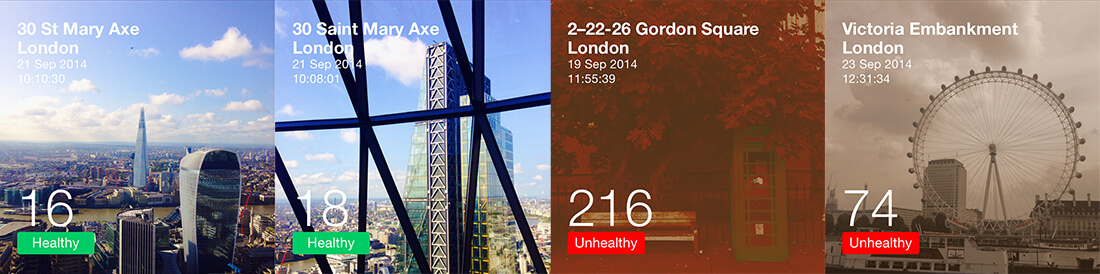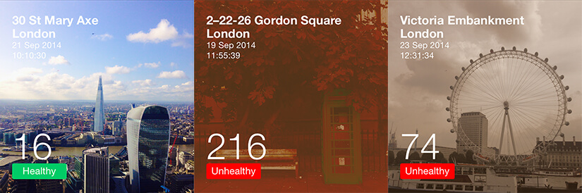 The app visualized air quality data using photograph as a medium and displayed numeric air quality data on top of the photo, with a green or red, healthy or unhealthy colour block.
